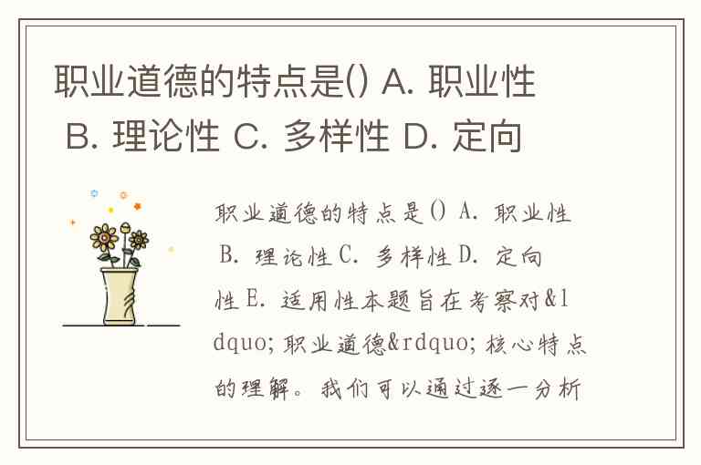 职业道德的特点是() A. 职业性 B. 理论性 C. 多样性 D. 定向性 E. 适用性