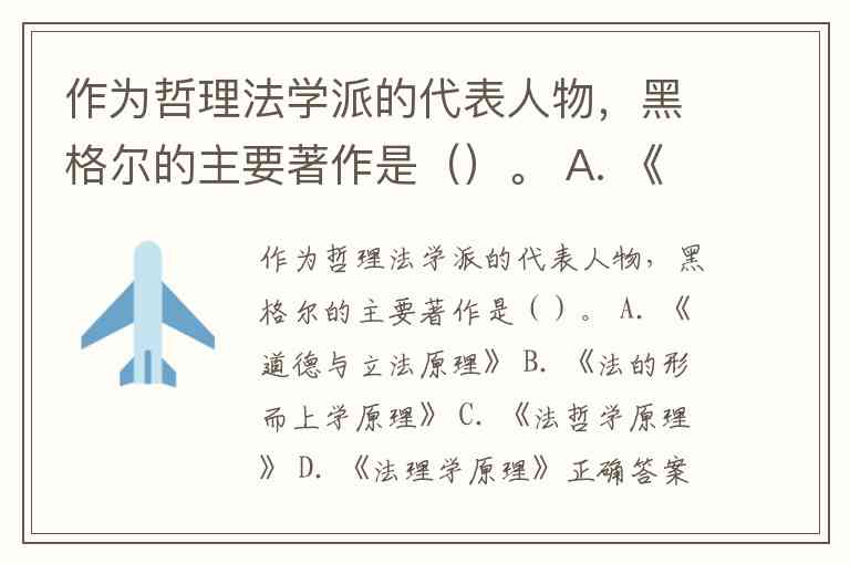 作为哲理法学派的代表人物,黑格尔的主要著作是()。 A. 《道德与立法原理》 B. 《法的形而上学原理》 C. 《法哲学原理》 D. 《法理学原理》