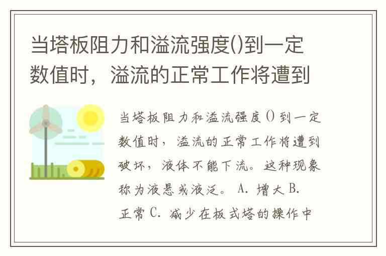 当塔板阻力和溢流强度()到一定数值时,溢流的正常工作将遭到破坏,液体不能下流。这种现象称为液悬或液泛。 A. 增大 B. 正常 C. 减少