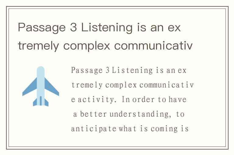 Passage 3 Listening is an extremely complex communicative activity. In order to have a better understanding, to anticipate what is coming is very important.An effective listener should continuously develop more or less specific readiness for what will come next. If a listener hears what he has expected, it will be much easier for him to receive the information.But if what he hears is totally out of his expectation,he will fail to get the message. The skill to anticipate what is coming in listening comprehension depends largely on the listener’s familiarity with the theme(主题)of the message.It also depends on the listener’s knowledge of the speaker as well as the situation. Obviously, when we listen to something that we already have some information about, it is generally much easier for us to take in the new information .Therefore,pre-listening preparation seems to play an important role in increasing our comprehension .Before actual listening ,we could perhaps first give some thought to the topic ,discuss it with others ,and then read some related material and do some vocabulary work. If we could make ourselves fully prepared for the coming talks or lectures,we are more likely to become effective listeners. Of course,readiness beforehand is not at all enough .Active thinking must take place all the way through .In fact ,we should always try to think ahead of the speaker. The passage is most possible taken from ____ .重试 错误原因 A.重试 错误原因 a novel重试 错误原因 B.重试 错误原因 a textbook重试 错误原因 C.重试 错误原因 a news report重试 错误原因 D.重试 错误原因 a fashion magazine重试 错误原因