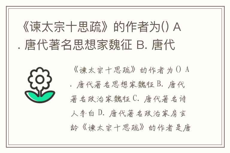 《谏太宗十思疏》的作者为() A. 唐代著名思想家魏征 B. 唐代著名政治家魏征 C. 唐代著名诗人李白 D. 唐代著名政治家房玄龄