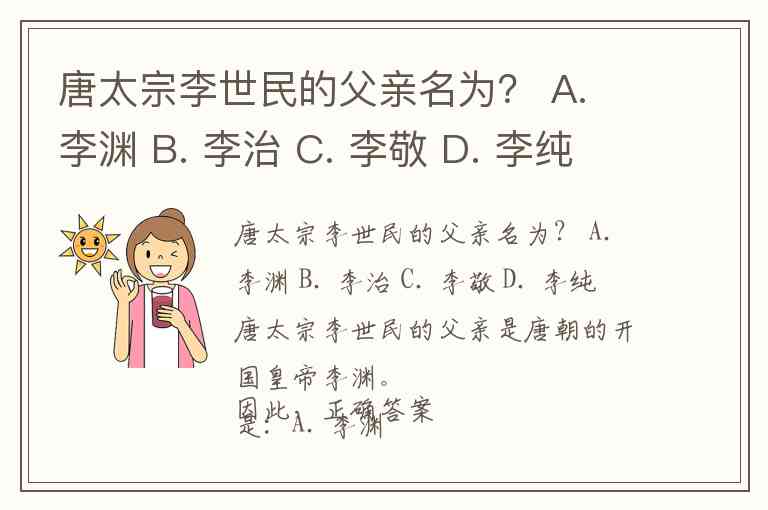 唐太宗李世民的父亲名为? A. 李渊 B. 李治 C. 李敬 D. 李纯