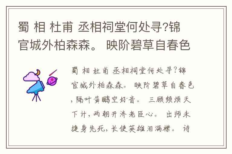 蜀 相 杜甫 丞相祠堂何处寻?锦官城外柏森森。 映阶碧草自春色,隔叶黄鹂空好音。 三顾频烦天下计,两朝开济老臣心。 出师未捷身先死,长使英雄泪满襟。 诗中,那一句是“合”( ) A. 丞相祠堂何处寻?锦官城外柏森森。 B. 映阶碧草自春色,隔叶黄鹂空好音。 C. 三顾频烦天下计,两朝开济老臣心。 D. 出师未捷身先死,长使英雄泪满襟。