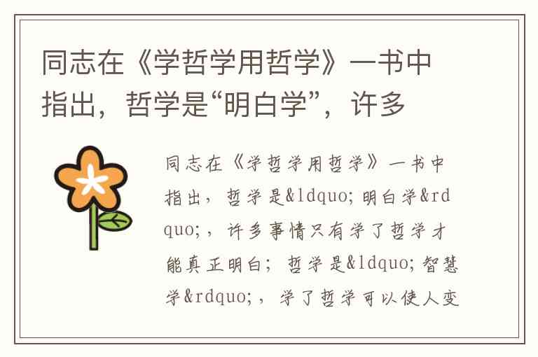同志在《学哲学用哲学》一书中指出,哲学是“明白学”,许多事情只有学了哲学才能真正明白;哲学是“智慧学”,学了哲学可以使人变聪明,脑子活、眼睛亮、办法多。不学哲学,天赋再好也不能算明白人。回答问题。 学了哲学可以使人变聪明,办法多,这是因为() A. 哲学与人们的生活密切相关 B. 哲学起源于人们对世界的思考 C. 哲学起源于生活,引导人们追求向上的生活 D. 真正的哲学能够为人们的生活和实践提供有益的指导