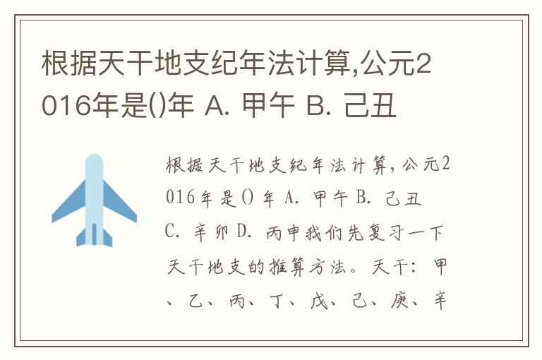 根据天干地支纪年法计算,公元2016年是()年 A. 甲午 B. 己丑 C. 辛卯 D. 丙申