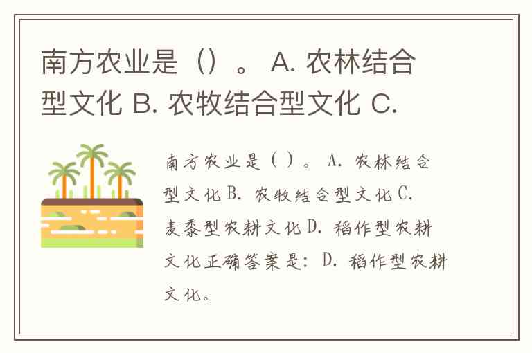 南方农业是()。 A. 农林结合型文化 B. 农牧结合型文化 C. 麦黍型农耕文化 D. 稻作型农耕文化