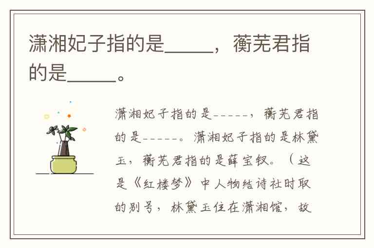 (这是《红楼梦》中人物结诗社时取的别号,林黛玉住在潇湘馆,故号“潇湘妃子”;薛宝钗住在蘅芜苑,故号“蘅芜君”。)