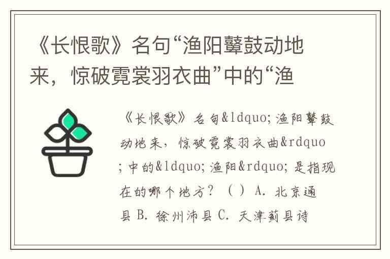 《长恨歌》名句“渔阳鼙鼓动地来,惊破霓裳羽衣曲”中的“渔阳”是指现在的哪个地方?() A. 北京通县 B. 徐州沛县 C. 天津蓟县