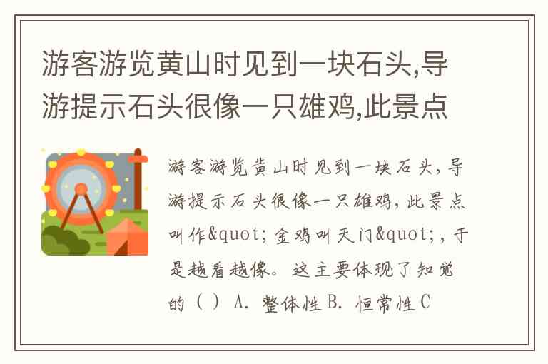 游客游览黄山时见到一块石头,导游提示石头很像一只雄鸡,此景点叫作"金鸡叫天门",于是越看越像。这主要体现了知觉的() A. 整体性 B. 恒常性 C. 选择性 D. 理解性
