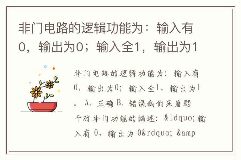 非门电路的逻辑功能为:输入有0,输出为0;输入全1,输出为1。 A. 正确 B. 错误