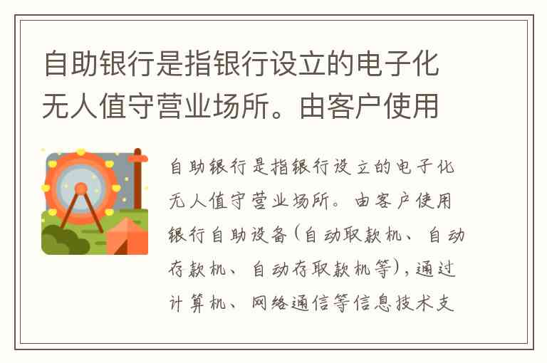 自助银行是指银行设立的电子化无人值守营业场所。由客户使用银行自助设备(自动取款机、自动存款机、自动存取款机等),通过计算机、网络通信等信息技术支持,自行完成取款、存款、转账和查询等金融服务。