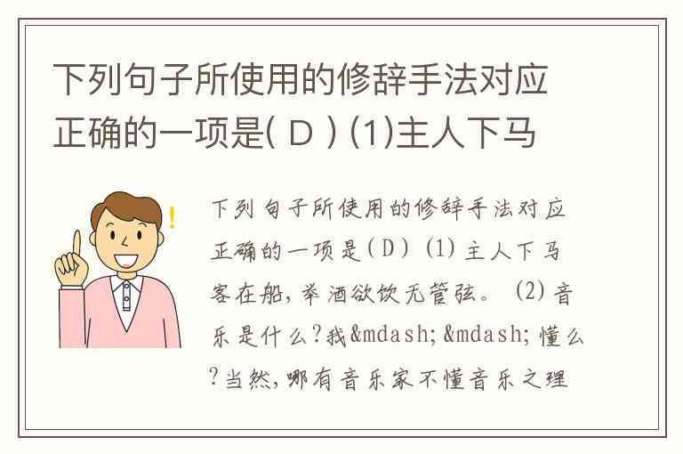 下列句子所使用的修辞手法对应正确的一项是( D ) (1)主人下马客在船,举酒欲饮无管弦。 (2)音乐是什么?我——懂么?当然,哪有音乐家不懂音乐之理! (3)中国画家爱画风雨归舟,爱画“斜风细雨不须归”的诗境。 (4)他被世人所期待、所仰慕、所赞誉,是由于它的美。 (5)微风过处,送来缕缕清香,仿佛远处高楼上渺茫的歌声似的。 A. 对偶 反问 比喻 排比 通感 B. 对偶 反问 引用 排比 比喻 C. 互文 设问 引用 排比 比喻 D. 互文 设问 引用 排比 通感