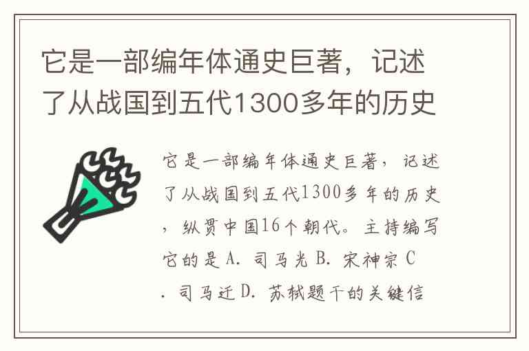 它是一部编年体通史巨著,记述了从战国到五代1300多年的历史,纵贯中国16个朝代。主持编写它的是 A. 司马光 B. 宋神宗 C. 司马迁 D. 苏轼