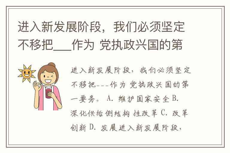 进入新发展阶段,我们必须坚定不移把___作为 党执政兴国的第一要务。 A. 维护国家安全 B. 深化供给侧结构 性改革 C. 改革创新 D. 发展