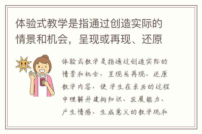 体验式教学是指通过创造实际的情景和机会,呈现或再现、还原教学内容,使学生在亲历的过程中理解并建构知识、发展能力、产生情感、生成意义的教学观和教学形式。