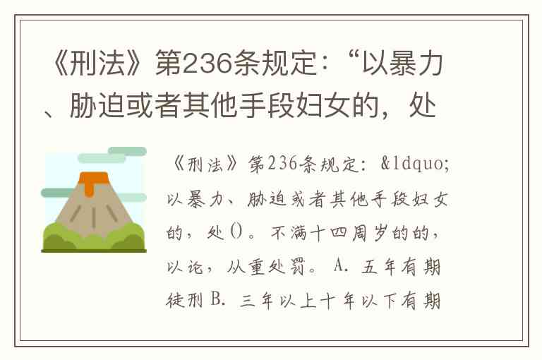 《刑法》第236条规定:“以暴力、胁迫或者其他手段妇女的,处()。不满十四周岁的的,以论,从重处罚。 A. 五年有期徒刑 B. 三年以上十年以下有期徒刑 C. 一年有期徒刑