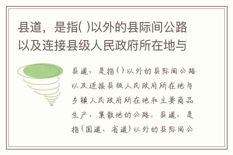 县道,是指(国道、省道)以外的县际间公路以及连接县级人民政府所在地与乡镇人民政府所在地和主要商品生产、集散地的公路。