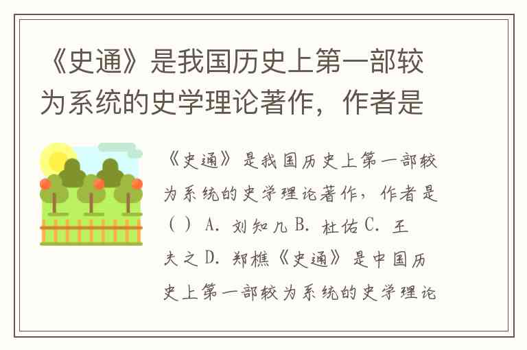 《史通》是我国历史上第一部较为系统的史学理论著作,作者是() A. 刘知几 B. 杜佑 C. 王夫之 D. 郑樵