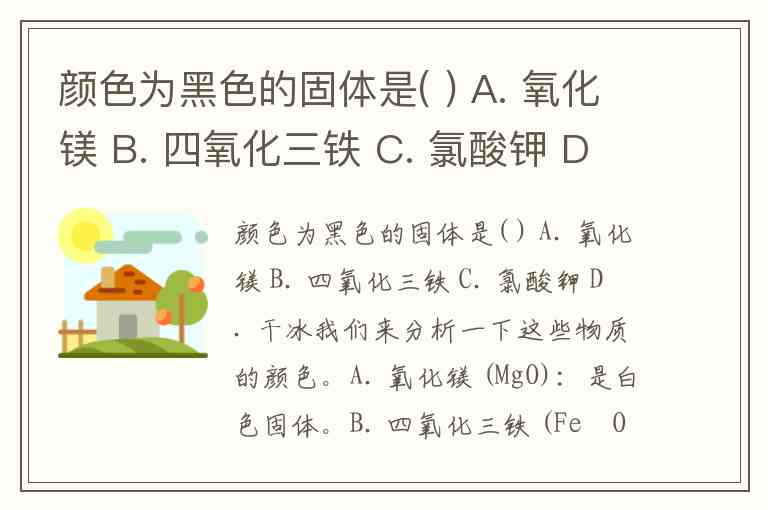 颜色为黑色的固体是( ) A. 氧化镁 B. 四氧化三铁 C. 氯酸钾 D. 干冰