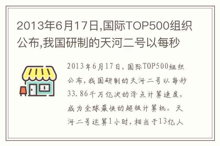 2013年6月17日,国际TOP500组织公布,我国研制的天河二号以每秒33.86千万亿次的浮点计算速度,成为全球最快的超级计算机。天河二号运算1小时,相当于13亿人同时用计算器计算1 000年,其存储总容量相当于可存储每册10万字的图书600亿册。这一事实足以说明( ) A. 科技发展可以使电脑具有思维功能 B. 科技使人脑能够加工改造客观事物 C. 实践活动是有目的的能动性的活动 D. 人的认识能力的高低决定实践水平