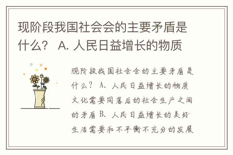 现阶段我国社会会的主要矛盾是什么? A. 人民日益增长的物质文化需要同落后的社会生产之间的矛盾 B. 人民日益增长的美好生活需要和不平衡不充分的发展之间的矛盾