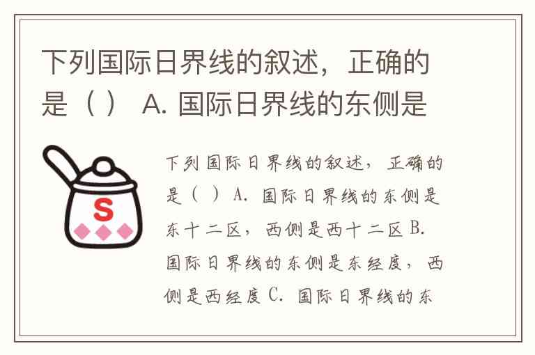 下列国际日界线的叙述,正确的是( ) A. 国际日界线的东侧是东十二区,西侧是西十二区 B. 国际日界线的东侧是东经度,西侧是西经度 C. 国际日界线的东侧的钟点比西侧的钟点晚1小时 D. 国际日界线的东侧的日期比西侧的日期晚一天