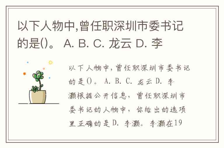 以下人物中,曾任职深圳市委书记的是()。 A. B. C. 龙云 D. 李灏