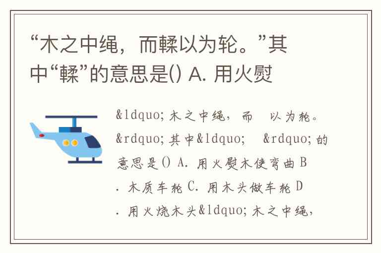 “木之中绳,而輮以为轮。”其中“輮”的意思是() A. 用火熨木使弯曲 B. 木质车轮 C. 用木头做车轮 D. 用火烧木头