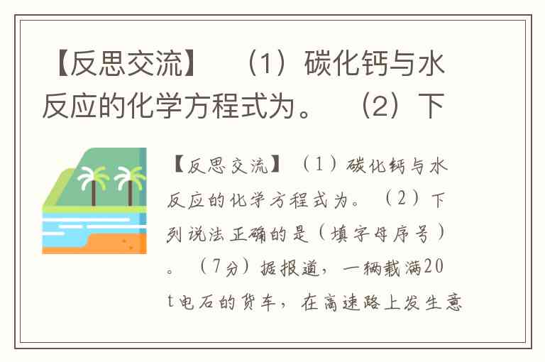 【反思交流】 (1)碳化钙与水反应的化学方程式为。 (2)下列说法正确的是(填字母序号)。 (7分) 据报道,一辆载满20t电石的货车,在高速路上发生意外,燃起大火并伴有大量黑烟,这辆货车在雨中燃烧了很长时间。某化学小组对电石中碳化钙(CaC2)的性质产生了兴趣,进行了下列探究活动。 【查阅资料】①碳化钙与水反应生成一种可燃性气体和一种白色固体。 ②乙炔(C2H2)气体燃烧时伴有大量黑烟。 【猜想假设】甲同学对碳化钙与水反应的生成物作出如下猜想: 可燃性气体可能是:①氢气 ②氧气 ③乙炔 白色固体可能是: ①氧化钙 ②氢氧化钙 ③碳酸钙 (1)你认为甲同学猜想的理由是 。 (2)其他同学讨论后认为甲同学的猜想有不合理之处,请指出并说明理由 。 【实验探究】 步骤1:取适量碳化钙加水,收集生成的气体,验纯后点燃,气体燃烧,伴有大量黑烟,说明碳化钙与水反应产生的气体是 。 步骤2:取适量反应后生成的固体于试管中, ,说明碳化钙与水反应产生的固体是氢氧化钙。 【反思交流】 (1)碳化钙与水反应的化学方程式为 。 (2)下列说法正确的是 (填字母序号)。 A.碳化钙与水反应放热 B.碳化钙应贮存在阴凉干燥的库房 C.碳化钙与水反应可用于测定电石中碳化钙的含量 D.实验室用电石与水制乙炔的发生装置与制氧气完全相同
