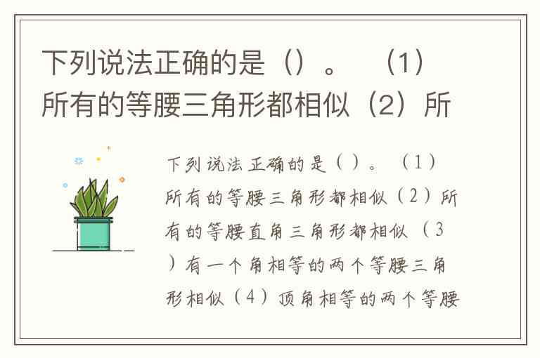下列说法正确的是()。 (1)所有的等腰三角形都相似(2)所有的等腰直角三角形都相似 (3)有一个角相等的两个等腰三角形相似(4)顶角相等的两个等腰三角形相似 A. (1)(2) B. (2)(4) C. (1)(3) D. (3)(4)