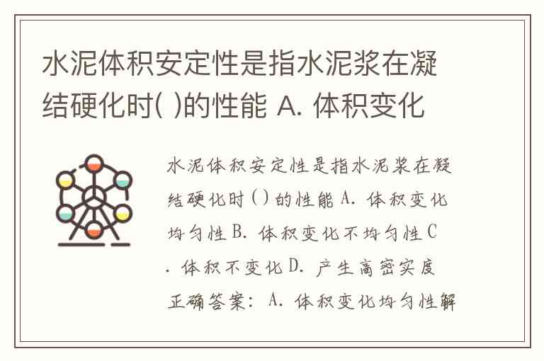 水泥体积安定性是指水泥浆在凝结硬化时( )的性能 A. 体积变化均匀性 B. 体积变化不均匀性 C. 体积不变化 D. 产生高密实度