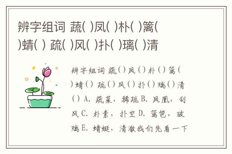 辨字组词 蔬( )凤( )朴( )篱( )蜻( ) 疏( )风( )扑( )璃( )清( ) A. 蔬菜,稀疏 B. 凤凰,刮风 C. 朴素,扑空 D. 篱笆,玻璃 E. 蜻蜓,清澈