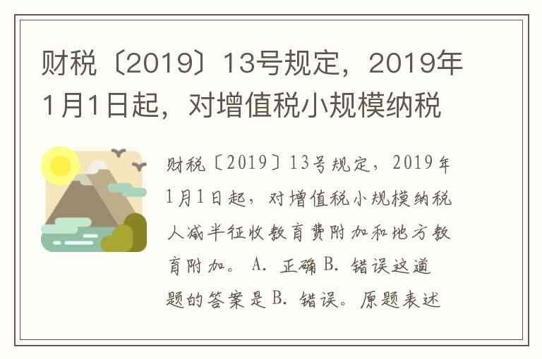 财税〔2019〕13号规定,2019年1月1日起,对增值税小规模纳税人减半征收教育费附加和地方教育附加。 A. 正确 B. 错误
