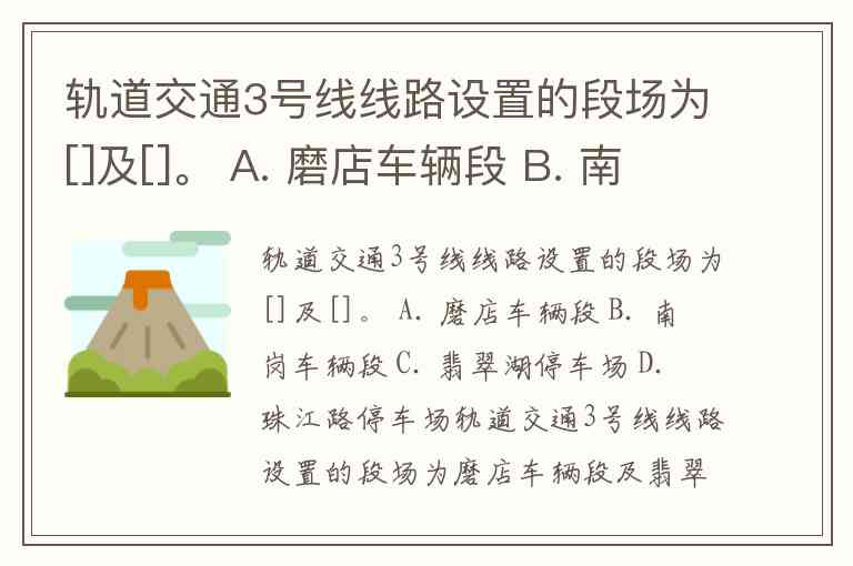 解析:根据合肥市轨道交通3号线开通运营时的官方新闻发布以及后续多项官方招标公告显示,3号线的车辆基地配置为“一段一场”,即线路东端设磨店车辆段,线路西端设翡翠湖停车场-2-3-4。这一配置在近年的轨道维保、物业招标文件中被反复印证-1-4-8。