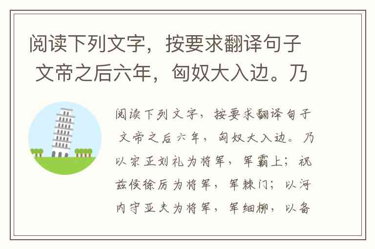 阅读下列文字,按要求翻译句子 文帝之后六年,匈奴大入边。乃以宗正刘礼为将军,军霸上;祝兹侯徐厉为将军,军棘门;以河内守亚夫为将军,军细柳,以备胡。 上自劳军。至霸上及棘门军,直驰入,将以下骑送迎。已而之细柳军,军士吏被甲,锐兵刃,彀,持满。天子先驱至,不得入。先驱曰:“天子且至!”军门都尉曰:“将军令曰‘军中闻将军令,不闻天子之诏’。”居无何,上至,又不得入。于是上乃使使持节诏将军:“吾欲入劳军。”亚太乃传言开壁门。壁门士吏谓从属车骑曰:“将军约,军中不得驱驰。”于是天子乃按辔徐行。至营,将军亚夫持兵揖曰:“介胄之士不拜,请以军礼见。”天子为动,改容式车。使人称谢:“皇帝敬劳将军。”成礼而去。既出军,群臣皆惊。文帝曰:“嗟乎,此真将军矣!曩者霸上、棘门军,若儿戏耳,其将固可袭而虏也。至于亚夫,可得而犯邪!” 称善者久之。月余,三军皆罢。乃拜亚夫为中尉。 孝文且崩时,诫太子曰:“即有缓急,周亚夫真可任将兵。”文帝崩,拜亚夫为车骑将军。(《史记·绛侯世家》) 翻译:即有缓急,周亚失真可任将兵。 [译文]____________________________________________________________________