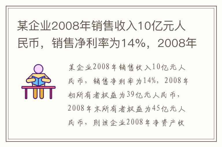 某企业2008年销售收入10亿元人民币,销售净利率为14%,2008年初所有者权益为39亿元人民币,2008年末所有者权益为45亿元人民币,则该企业2008年净资产收益率为( )。 A. 0.03 B. 0.0311 C. 0.0333 D. 0.0358