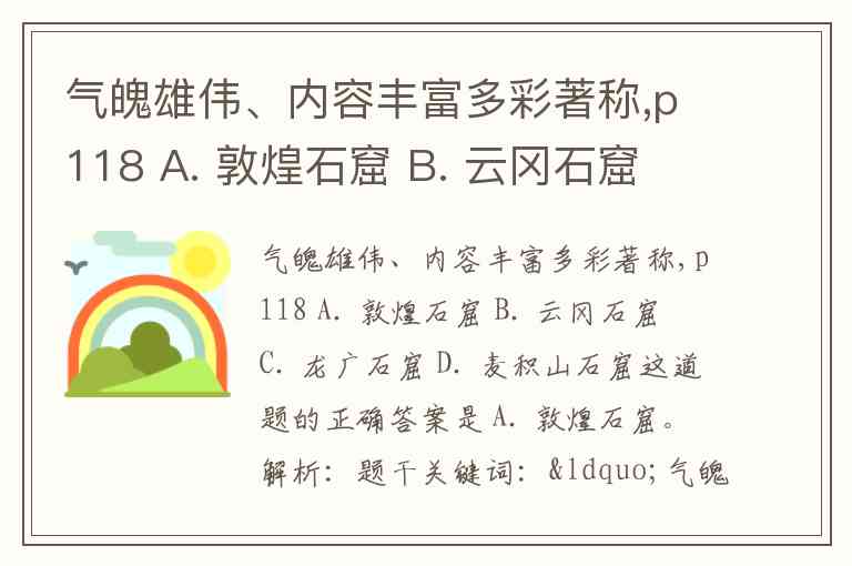 气魄雄伟、内容丰富多彩著称,p118 A. 敦煌石窟 B. 云冈石窟 C. 龙广石窟 D. 麦积山石窟