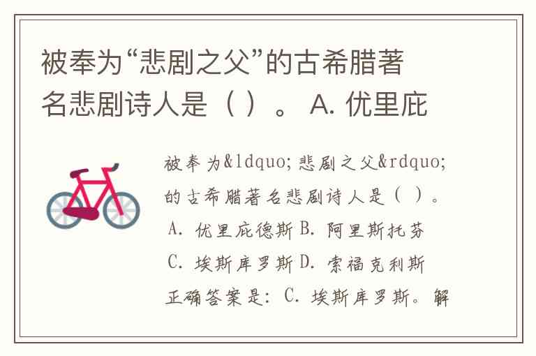 被奉为“悲剧之父”的古希腊著名悲剧诗人是( )。 A. 优里庇德斯 B. 阿里斯托芬 C. 埃斯库罗斯 D. 索福克利斯