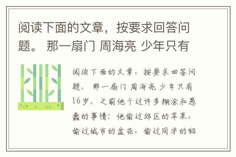 阅读下面的文章,按要求回答问题。 那一扇门 周海亮 少年只有16岁。之前他干过许多糊涂和愚蠢的事情:他偷过郊区的苹果,偷过城市的盆花,偷过同学的铅笔和饼干,偷过邻居的茶杯和腊肉,还偷过大街上的自行 车。他一次次被带进派出所又被一次次放出来。某一天,他猛然意识到自己长大了,意识到自己错了,意识到自己应该悬崖勒马痛改前非了。 他后悔,他想改,可是他已经挽回不了自己的声誉和尊严,他已经没有了任何的朋友。他一出现总会引来一些异样的目光。少年并不记恨他们,认为这是对他的惩罚。少年望着窗外,天阴沉沉的,没有一丝阳光。 整整一个夏天,每天上午,少年都把自己关在家中,透过窗子看外面的树。他忍受不了寂寞。到下午时,他悄悄出去,在小区转一圈,吸两口清新空气,看两眼空中 的飞乌——他还是少年。人们一见着他,或扭过头去,或老远就避开。邻居们防他,就像防一条带着传染病的狗。少年不敢上前,不敢与他们对视——他失去了与任 何人交流的勇气。他无奈,他自卑,似乎世界在他面前关起一扇门,又加上无数把锁。他垂着头慢慢地走,脚尖轻踢着一粒石子。没有阳光,少年却感觉到后背灼 热。忽然有人喊他,是一位坐在凉亭里的老人。老人朝他招手:“喂,年轻人!”他抬头,一愣,不敢相信眼睛和耳朵。“您是在喊我吗”他指指自己。“过来, 年轻人!”老人说。他走过去,胆战心惊。他想逃离,可是却说服不了自己的脚步。老人叼一根没有点燃的香烟,摸着口袋,问他:“有火柴吗”“没有。”“打 火机呢”“也没有。”说完,他急急地低了头,试图离开。“别急着走。”老人再一次喊住他,“去帮我取来打火机吧,我的家,你知道的。”他当然知道。老人 与他同住一个单元,他住七楼,老人住一楼。“我的腿脚不中用。”老人笑呵呵地说,“打火机放在茶几上,麻烦你帮我取来。”少年心中划过一道闪电。可是那闪 电转瞬即逝。“钥匙呢”他问。“门没有锁。”老人说,“我从来不锁门的。住咱们这个小区,根本不必锁门。”少年心中又是一道转瞬即逝的闪电。少年飞奔而 去,途中流下眼泪。一缕阳光从云缝里钻了出来。 那扇看起来冷冰冰的防盗门果然没有上锁,他伸手轻轻一推,便开了。茶几上放着果盘。放着零钱,放着钥匙和打火机。少年抓起打火机,返身跑出屋子。 老人点着了烟,郑重地对少年表示感谢。然后,他对少年说:“如果你有时间,如果你愿意,我们下一盘象棋,好吗”少年当然愿意。他坐下来,聚精会神地和老人下起了象棋。不久。少年便败下阵来,可他脸上露出了久违的笑容。凉亭外,阳光灿烂…… 少年后来成为一名警察,老人的身体仍然很好,闲时,他们仍然会凑到一起下象棋。他多次跟老人谈起那件事情,他说那天你故意不锁门,那天,你口袋里,其实装着打火机。 老人只笑不语。问急了,老人就说:我忘记了,我真的忘记了。或许真如你说,那天的一切都是我故意的;或许那几年里,我出门真的从不锁门;或许,那一天其实 什么也没有发生,一切不过是你的一个美好梦境。不过我认为,这一切都无关紧要,重要的,是你亲手推开了那扇门,而不是别人…… 问题: 题目中的“门”,可以理解成哪些门联系全文,分别简要说明。(4分)