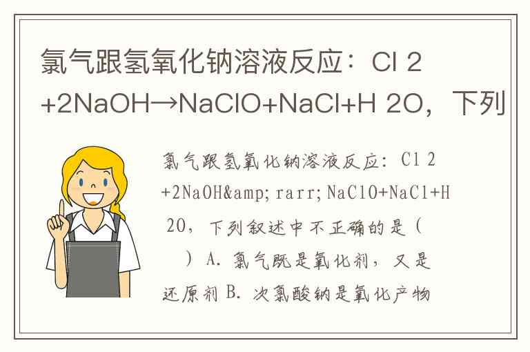 氯气跟氢氧化钠溶液反应:Cl 2+2NaOH→NaClO+NaCl+H 2O,下列叙述中不正确的是( ) A. 氯气既是氧化剂,又是还原剂 B. 次氯酸钠是氧化产物,氯化钠是还原产物 C. 氢氧化钠既不是氧化剂,也不是还原剂 D. 电子的转移数是2,从氯气转移到氢氧化钠