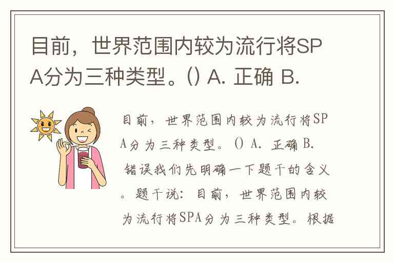 所以如果题干是针对“比较流行将SPA分为三种类型”这个说法,从目前旅游行业知识来看,这是正确的。