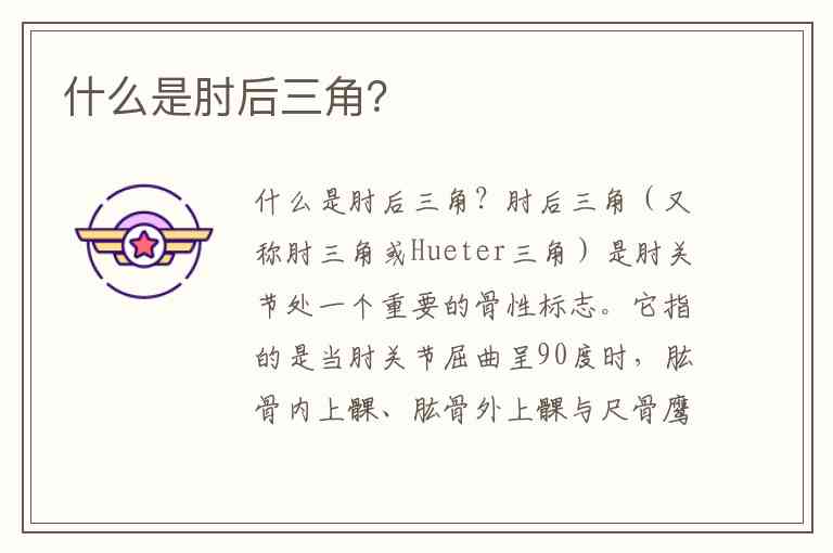 肘后三角(又称肘三角或Hueter三角)是肘关节处一个重要的骨性标志。它指的是当肘关节屈曲呈90度时,肱骨内上髁、肱骨外上髁与尺骨鹰嘴窝这三个骨性突起在肘后部构成的一个等腰三角形。