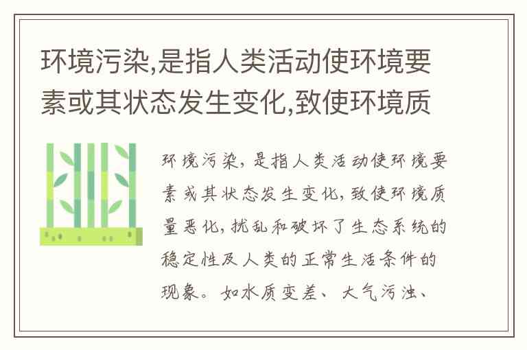 环境污染,是指人类活动使环境要素或其状态发生变化,致使环境质量恶化,扰乱和破坏了生态系统的稳定性及人类的正常生活条件的现象。