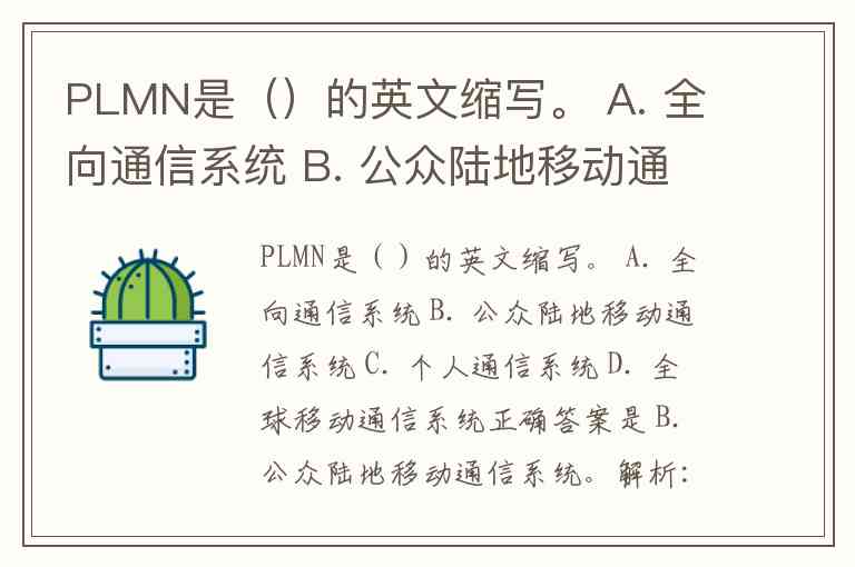 PLMN是()的英文缩写。 A. 全向通信系统 B. 公众陆地移动通信系统 C. 个人通信系统 D. 全球移动通信系统