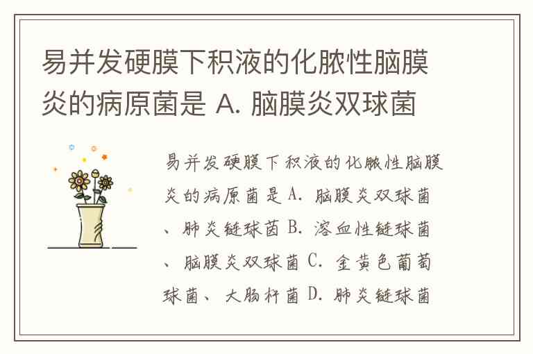 A(脑膜炎双球菌):流行性脑脊髓膜炎的病原体,虽然常见,但并发硬膜下积液的几率远低于肺炎链球菌和流感嗜血杆菌。