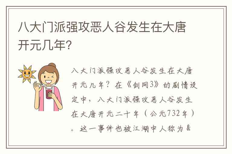 在《剑网3》的剧情设定中,八大门派强攻恶人谷发生在大唐开元二十年(公元732年)。这一事件也被江湖中人称为 “开元惨变” -2-6-9。