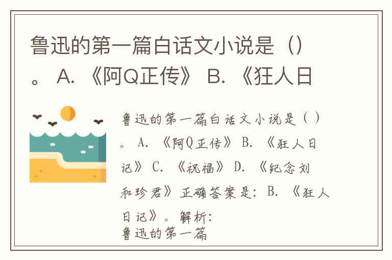 鲁迅的第一篇白话文小说是()。 A. 《阿Q正传》 B. 《狂人日记》 C. 《祝福》 D. 《纪念刘和珍君》