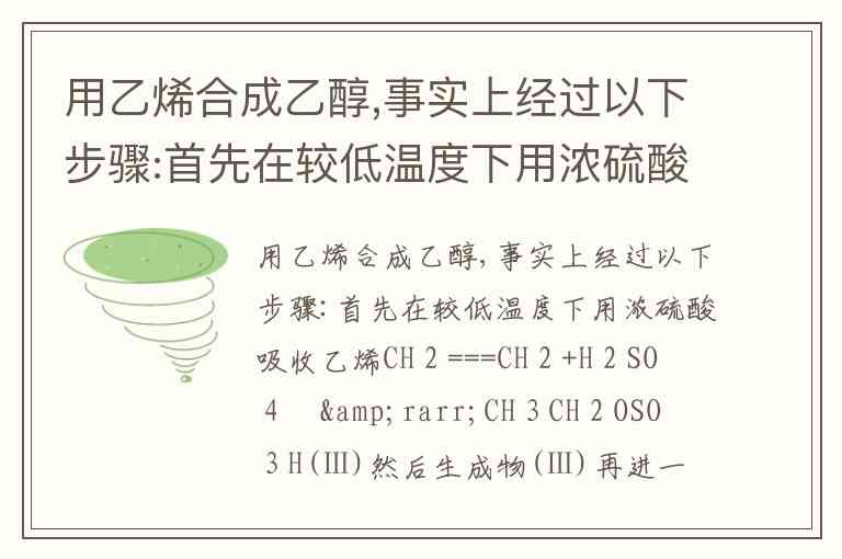 用乙烯合成乙醇,事实上经过以下步骤:首先在较低温度下用浓硫酸吸收乙烯CH 2 ===CH 2 +H 2 SO 4 ―→CH 3 CH 2 OSO 3 H(Ⅰ)然后生成物(Ⅰ)再进一步吸收乙烯CH 3 CH 2 OSO 3 H+CH 2 ===CH 2 ―→(CH 3 CH 2 O) 2 SO 2 (Ⅱ)再参加水,(Ⅰ)和(Ⅱ)都与水反响生成乙醇CH 3 CH 2 OSO 3 H+H 2 O―→CH 3 CH 2 OH+H 2 SO 4(CH 3 CH 2 O) 2 SO 2 +2H 2 O―→2CH 3 CH 2 OH+H 2 SO 4以下表达中错误的选项是( )。 A. 化合物(Ⅰ)(Ⅱ)都属于酯类 B. 以上四个反响类型相同 C. 以上四个反响类型不相同 D. 此方法的缺点是设备易腐蚀