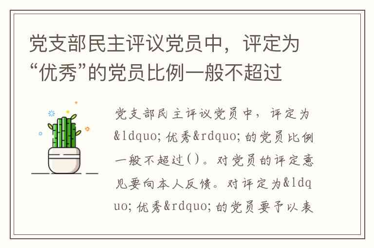 根据《中国共产党支部工作条例(试行)》及相关党务知识,民主评议党员按照“优秀”“合格”“基本合格”“不合格”四个等次进行评定,其中评定为“优秀”的比例一般不超过党员总数的三分之一(1/3)-1-2-3。这一比例限制旨在确保评议结果客观公正,避免“好人主义”或平衡照顾,让评定结果真正反映党员的现实表现 -9。