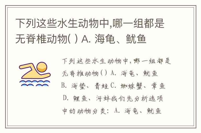 下列这些水生动物中,哪一组都是无脊椎动物( ) A. 海龟、鱿鱼 B. 海蛰、青蛙 C. 蜘蛛蟹、章鱼 D. 鲤鱼、河蚌
